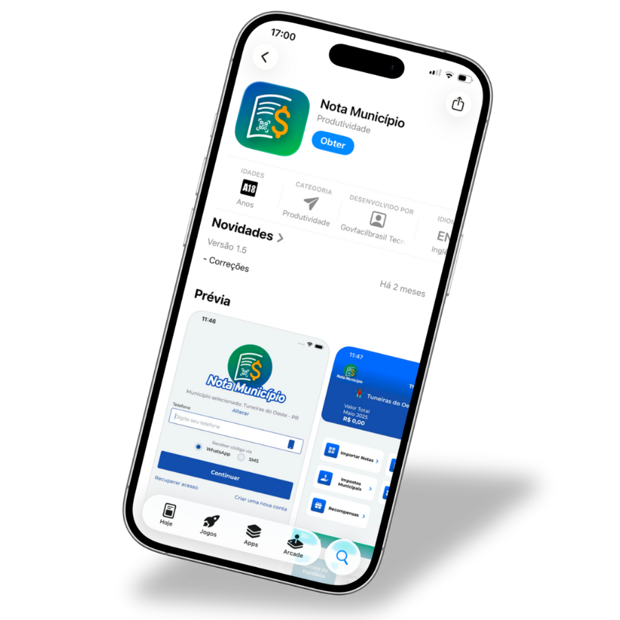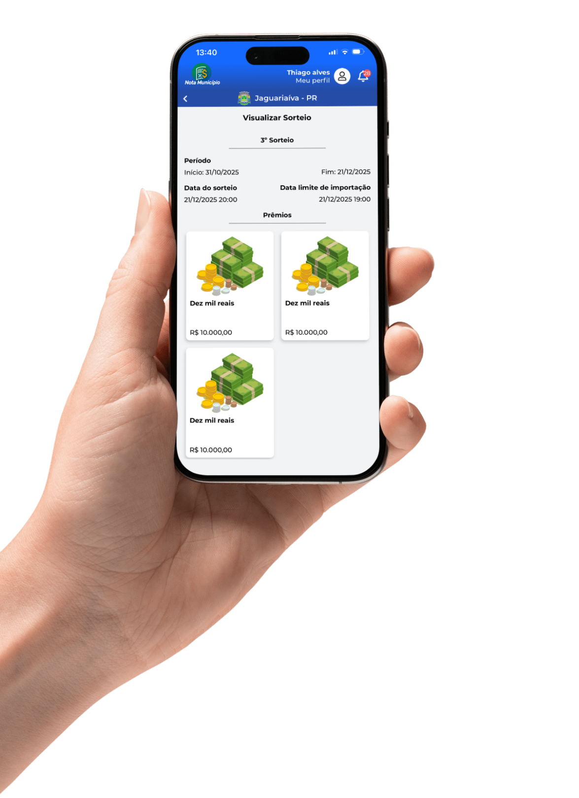 O aplicativo Nota Município transforma suas notas fiscais em oportunidades. Ao informar o CPF na nota, cada compra pode gerar bilhetes para concorrer em sorteios definidos pelo seu município. Para participar, basta usar a câmera do celular e ler o QR Code da nota fiscal.